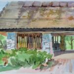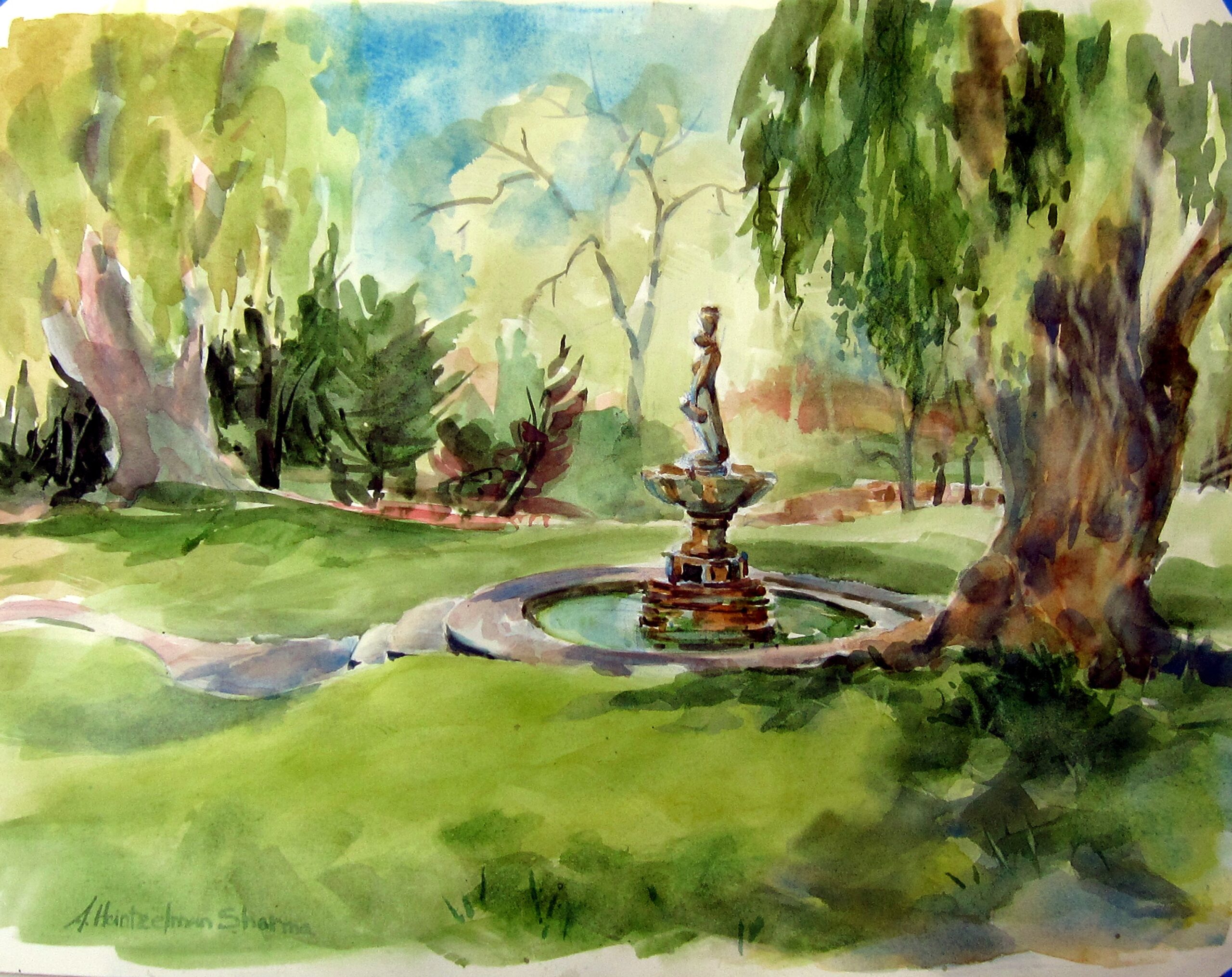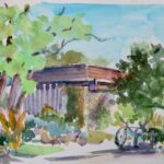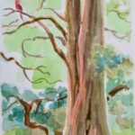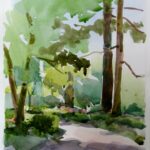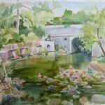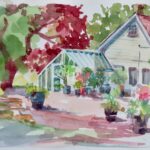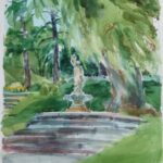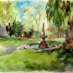 I have been painting in Edwards Gardens every summer for the past 20+ years on my own and with other members of the small Northview Group of Artists. I paint in watercolors for ease of transportation and as a way to capture the moment in a fluid manner. Because I paint sitting on the ground, all perspectives are “worms eye view”–meaning that I am seeing my subject from a very low stance.